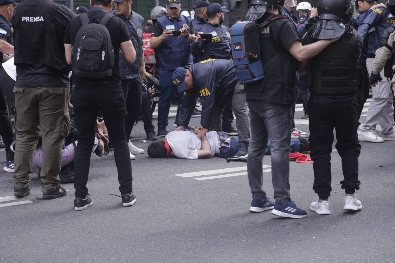 Uno de los momentos de máxima tensión se produjo cuando jubilados que intentaban cortar la calle fueron derribados por la policía. “Nos tiraron al piso. Me pisó uno, me pisaron la mano”, relató un hombre de 73 años.