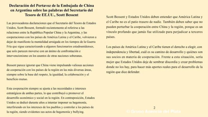 La controversia se desató luego de que Bessent sugiriera que el presidente Javier Milei “está decidido a sacar a China de la Argentina”. En respuesta, la Embajada de China en Argentina sentenció que las “provocadoras declaraciones” del funcionario estadounidense “volvieron a dejar de manifiesto la mentalidad arraigada en los tiempos de la Guerra Fría que sigue caracterizando a algunos funcionarios estadounidenses”.