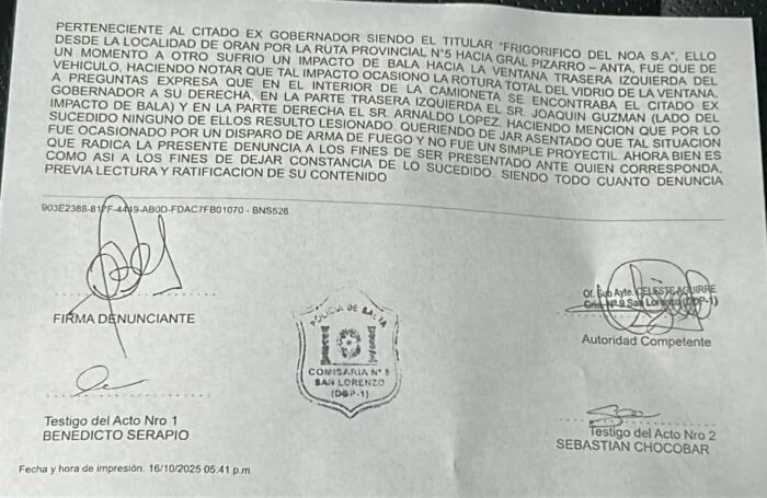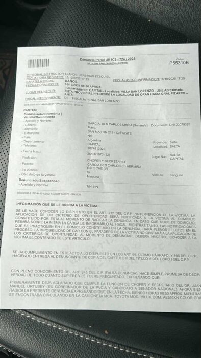 La denuncia penal fue radicada en la Comisaría N° 101 de San Lorenzo, por Carlos María García Bes, chofer y secretario de Urtubey, quien manejaba la Toyota Hilux color gris.