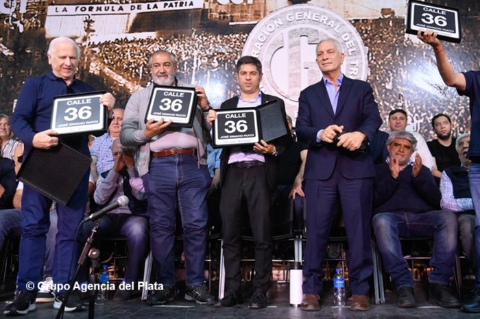 Axel Kicillof compartió el acto con el ministro de Trabajo Walter Correa, los dirigentes cegetistas Héctor Daer, Antonio Di Tomasso, los candidatos a diputados nacionales de Fuerza Patria Sergio Palazzo, Hugo Moyano (h), Jimena López, el intendente anfitrión Julio Alak, y Aníbal Rucci, hijo del histórico dirigente sindical José Ignacio Rucci, quien fue homenajeado durante el encuentro.