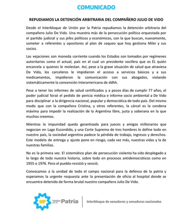 El interbloque también cuestionó las condiciones de detención de De Vido, al advertir que se le habría impedido el acceso a medicación, servicios básicos y comunicación con sus abogados, hechos que enmarcaron en una violación a estándares internacionales de derechos humanos.