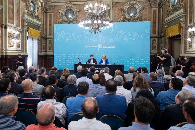 El gobernador Axel Kicillof encabezó una presentación en el Salón Dorado de la Gobernación junto a la vicegobernadora Verónica Magario para explicar por qué es necesario que el parlamento bonaerense apruebe la autorización de endeudamiento por hasta 3.304 millones de dólares, que viene siendo postergada debido a la falta de acuerdos políticos internos y con la oposición.