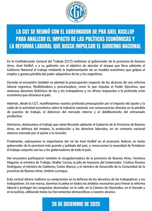 La Confederación General de Trabajadores recibió esta tarde al gobernador de la Provincia de Buenos Aires, Axel Kicillof, y a su gabinete de ministros, en el marco de las estrategias de los trabajadores y la oposición para enfrentar la reforma laboral que impulsa el presidente Milei, que comenzará a ser tratado en febrero en el Senado de la Nación.